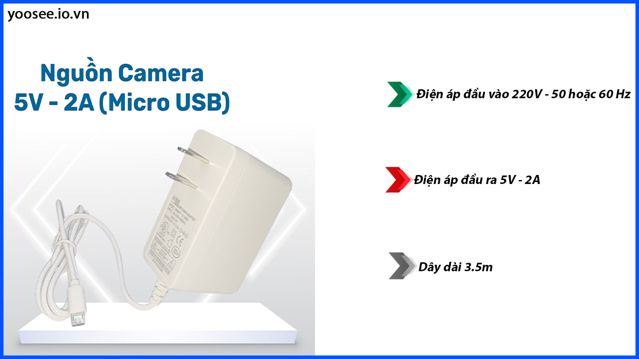 - Đây là ưu điểm quan trọng nhất của nguồn camera Yoosee 2 râu. Nguồn camera cung cấp dòng điện 5V 2A ổn định