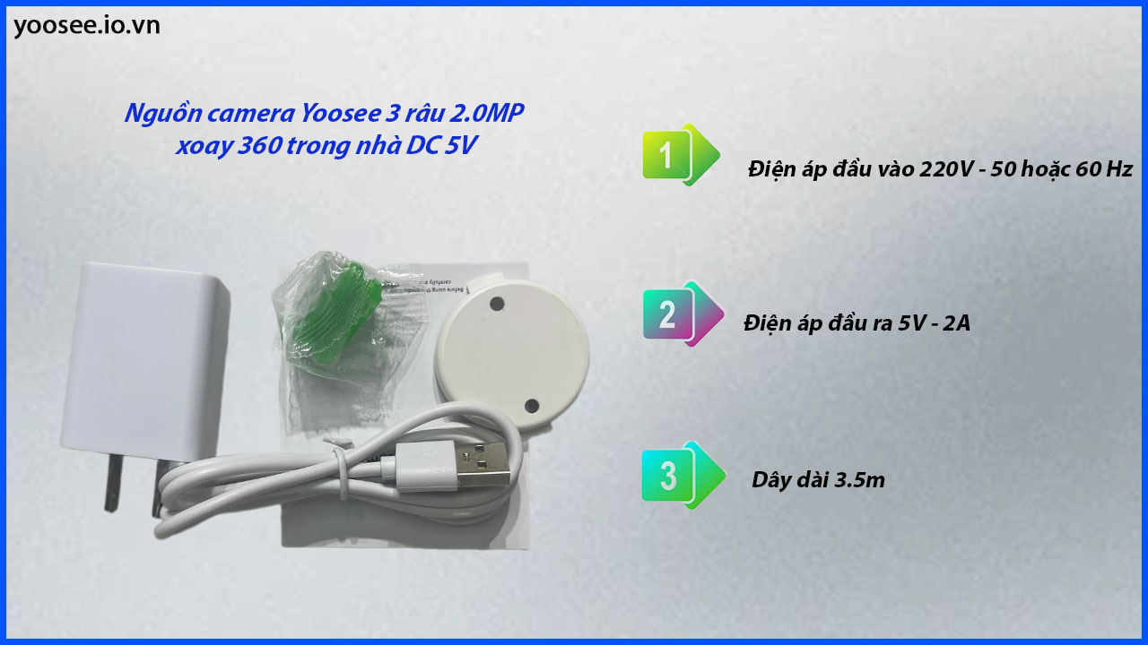 Nguồn camera Yoosee 3 Râu 2.0MP xoay 360 trong nhà DC 5V được thiết kế nhỏ gọn và sử dụng vật liệu chất lượng cao, nguồn có độ bền cao và tích hợp các tính năng bảo vệ chống quá tải